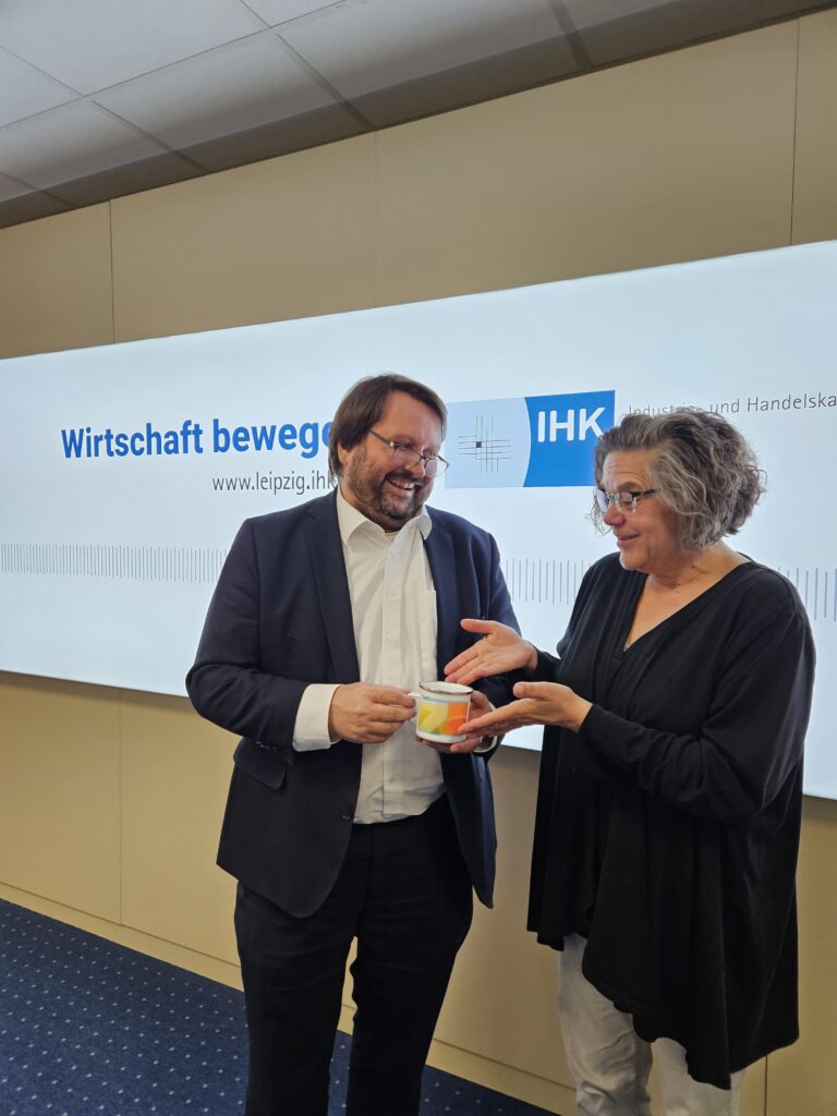 Eine Hauptaufgabe der eaf Sachsen besteht ja in der Netzwerkerei: Wir treffen uns und tauschen uns aus mit Menschen aus Politik, Kirche, Sozialwesen, Verbänden, Wissenschaft, aber auch immer wieder und sehr gerne aus der Wirtschaft. Am 1. April hat sich eaf-Geschäftsführerin Eva Brackelmann mit Dr. Fabian Magerl, Geschäftsführer der Industrie- und Handelskammer zu Leipzig, zum Gespräch getroffen. Selbstverständlich wurde eine Tasse der Herzen überreicht.