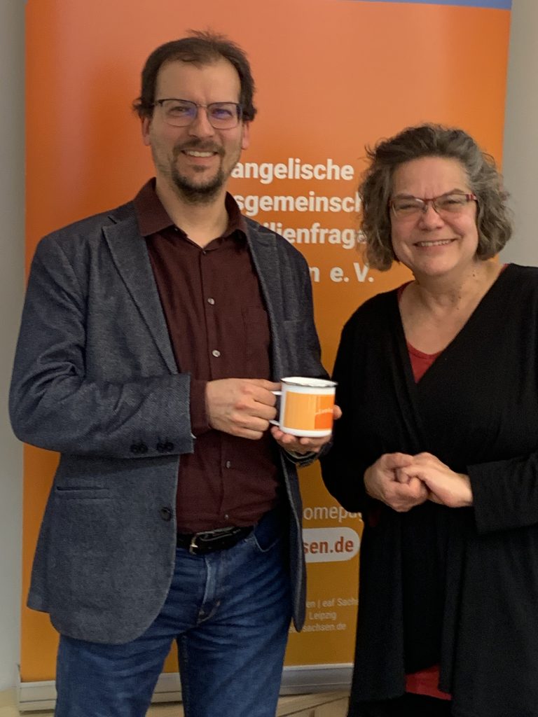 So viele nette Besucher*innen - und niemand geht ohne Familienfragen-Tasse nach Hause! In letzter Zeit vorbei geschaut haben: Miro Jennerjahn, Landesgeschäftsführer ARBEIT UND LEBEN Sachsen, MdL Ines Saborowski (CDU), Daniela Kolbe, Stellvertretende Vorsitzende DGB-Bezirk Sachsen. Auch die Presse interessiert sich für unsere Arbeit: Kirchenredakteurin Maxi Konang interviewte eaf-Geschäftsführerin Eva Brackelmann.